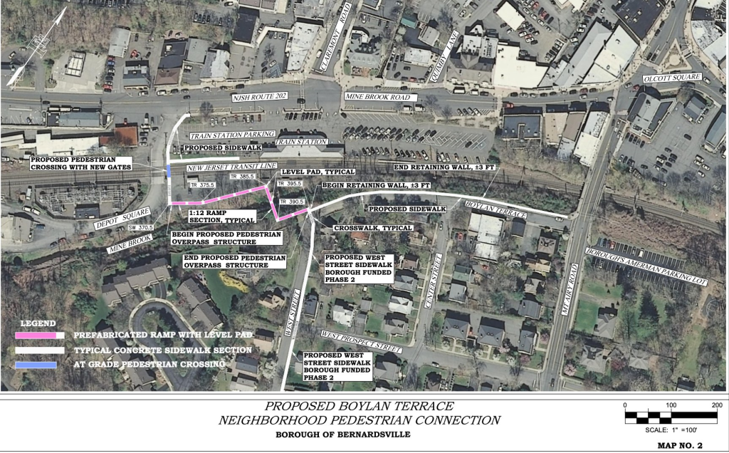 The Borough has recently prioritized creating a more pedestrian-friendly environment, adopting its Complete Streets policy in 2022 and securing $1.4 million in potential federal funds for a walkway linking Boylan Terrace with the station. The project included a pedestrian bridge, ADA-compliant ramps, and sidewalk and crossings upgrades. However, funding delays and arduous requirements led the Borough to reject the federal dollars in favor of state funding in 2025. Transit Village designation is expected to further support these infrastructure efforts.