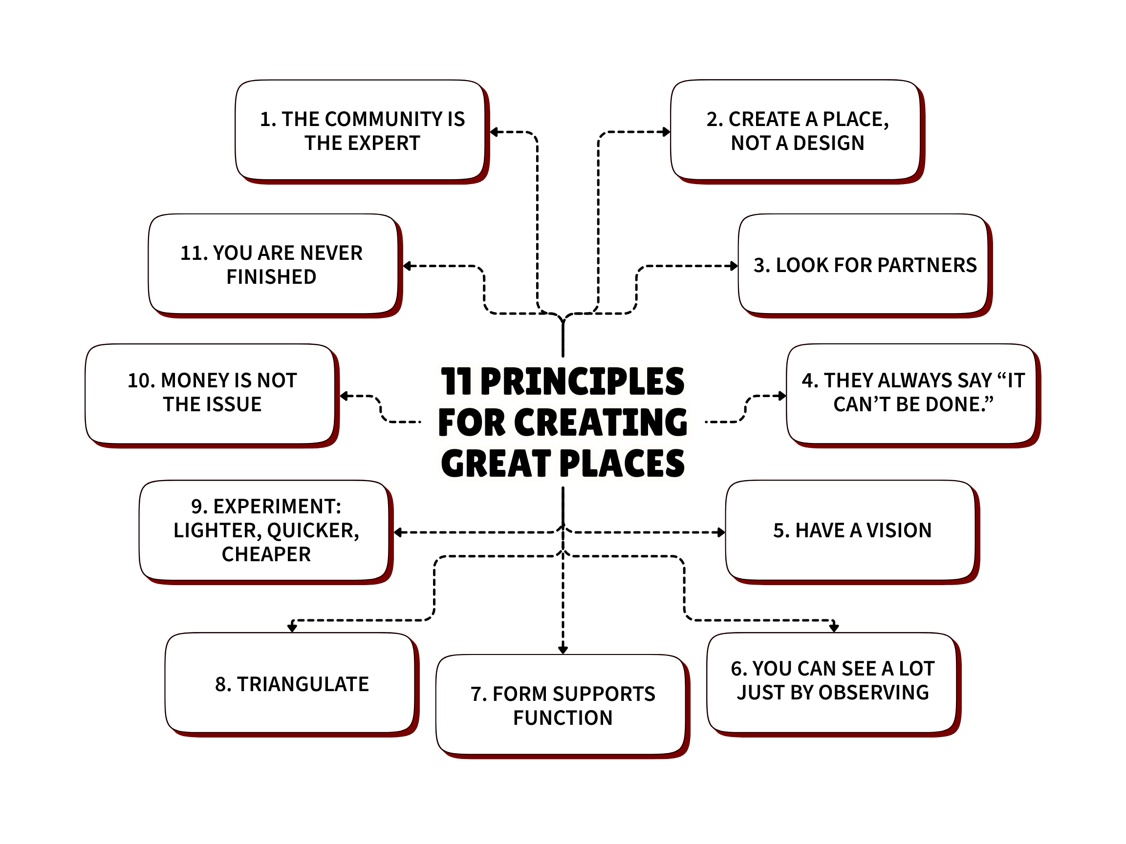 The Project for Public Spaces suggests eleven principles for developing great community places. A critical concept is triangulation—how different elements within a space (such as a bench, coffee kiosk, and a transit entrance) interact to draw people together. When placemaking near transit, the transit facility must be a primary anchor, ensuring seamless movement between it and the surrounding community.
