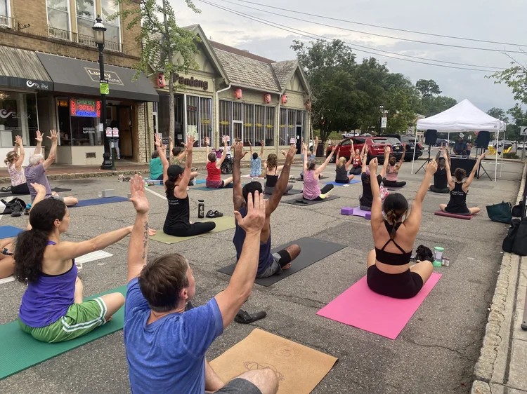 Outdoor yoga class on Village Plaza sponsored by the SID and a local yoga studio. Courtesy of South Orange Downtown