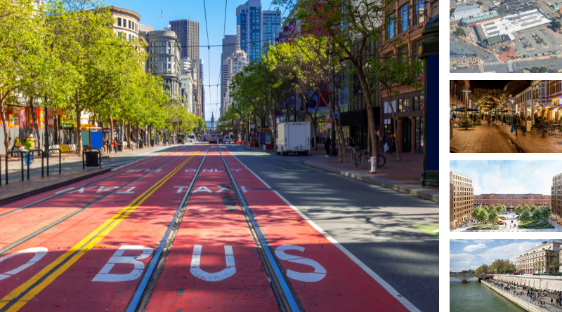 Bay Area 2050+ Plan (left) • Montclair development PILOT • Street design & affordability • 541 units in New Haven • Paris prioritizes pedestrians (right top-to-bottom)